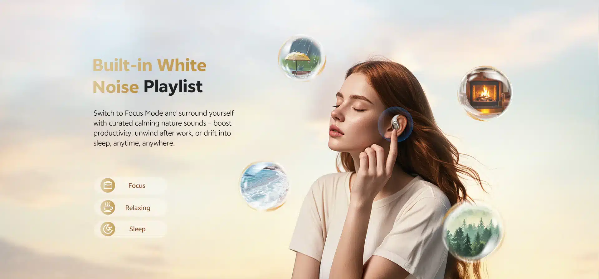 • Built-In White Noise Playlist: Switch to Focus Mode to access curated calming nature sounds. Boost productivity, unwind, or drift into sleep anytime, anywhere.